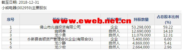 股票简称小熊电器 申购代码002959 上市地点深圳证券交易所中小企业板 发行价格(元/股) 发行市盈率 发行面值(元)1.00 实际募集资金总额(亿元) 网上发行日期2019-07-24 周三 网下配售日期2019-07-24 周三 网上发行数量(股)12,000,000 网下配售数量(股)18,000,000 老股转让数量(股)总发行量数(股) 申购数量上限(股)12,000 中签缴款日2019-07-26 周五 网上顶格申购需配市值(万元)12.00 网下申购需配市值(万元)1000.00 主承销商东莞证券股份有限公司 筹集资金将用于的项目:小熊电器创意小家电生产建设(大良五沙)项目,小熊电器信息化建设项目,小熊电器研发中心建设项目,小熊电器创意小家电生产建设(均安)项目,小熊电器智能小家电制造基地项目 截至日期: 2018-12-31 小熊电器(002959)主要股东 |