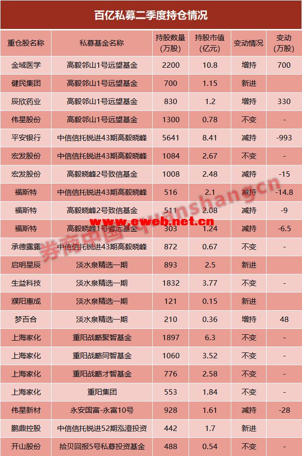 高毅、淡水泉、重阳、景林重仓股有哪些 随着半年报的陆续披露,不少私募的持仓纷纷出炉。 百亿私募作为市场的风向标,持仓动向尤为市场关注。近日,高毅、淡水泉、重阳、景林等多家百亿私募的最新持仓陆续曝光。截至8月16日,已披露半年报的公司中,私募基金登上了188只股票的十大流通股东名单,持仓市值达410亿元。 具体来看,高毅资产冯柳二季度新进健民集团,并加仓金域医学、辰欣药业,目前的持股市值已达14亿元;高毅首席投资官邓晓峰则减持了平安银行,小幅减持福斯特、宏发股份,目前持股市值达19亿。赵军的淡水泉也保持积极态势,新进了启明星辰、濮阳惠成,小幅增持梦百合。 而裘国根的重阳投资则选择坚守仓位,旗下四只产品合计持有4286万股上海家化,在十大流通股东中占据四席,持仓市值超过14亿。 虽然二季度外围局势错综复杂、国内经济有下行压力,A股也结束了小阳春开启震荡下行,从目前私募的持仓动向来看,多数私募们仍然不惧调整,选择买入、加仓或者持仓不动。 高毅持仓市值超30亿,冯柳大幅加仓金域医学 高毅“民间派”出身的投资高手冯柳以及首席投资官邓晓峰的持仓动向备受市场关注。今年一季度,两人联手登上了37家上市公司的十大流通股东名单,持股市值接近百亿。 截至目前,从已披露的半年报来看,冯柳与邓晓峰的持仓市值已达到33.58亿元。 二季度,擅长逆向投资的冯柳新进健民集团,高毅邻山1号远望基金买进700万股,位列第三大流通股东。半年报显示,健民集团实现营收11.12亿元,同比增长3.48%;净利润5595.6万元,同比下滑2.67%,主营产品的销量降了2成。健民集团是全国中成药小儿用药生产基地,近年股价持续下行。 同时,冯柳仍旧看好金域医学,继续大幅加仓。自2018年三季度高毅邻山1号远望基金首次进入金域医学的十大流通股东以来,冯柳此后连续三个季度加仓,本次更是大幅加仓了700万股,使得其持股总数量达2200万股,成为金域医学的第四大股东,仅单只股票持仓市值就达到10.8亿元。 值得注意的是,金域医学半年报业绩超出预期,营业收入25.43亿,同比增长20.26%,归母净利润1.72亿,同比增长78.92%。而年初至今,金域医学的股价大涨了121%,如此强势的表现令冯柳收获颇丰。 此外,冯柳还加仓了辰欣药业,持有的伟星股份暂时不变。 与冯柳相反,二季度邓晓峰的操作目前来看,较为谨慎。邓晓峰大幅减仓了平安银行,其中,高毅晓峰2号致信基金已经退出平安银行前十大流通股东之列,另一只产品锐进四十三期高毅晓峰投资信托减持平安银行993万股,目前持有平安银行5641万股,位列第九大流通股东。 同时,邓晓峰还小幅减持了福斯特以及略微减持了宏发股份,目前旗下三只产品持有福斯特1330万股,持股市值5.42亿;持有宏发股份2092万股,市值5.15亿元,均保持着较高的持仓水平。 此外,中信信托锐进43期高毅晓峰持有承德露露的股份不变。 重阳坚守上海家化,淡水泉新进启明星辰 二季度,百亿私募重阳投资选择坚守仓位。 8月15日晚,国内日化龙头上海家化发布了2019年半年报,上半年实现营业收入39.23亿元,同比增加7.02%;实现净利润4.44 亿元,较上年同期大增40.12%。 上海家化的业绩逐步改善,使得裘国根掌舵的重阳投资选择继续坚守上海家化。 截至6月底,重阳战略聚智基金、重阳战略同智基金、重阳战略才智基金、重阳集团有限公司等四只产品合计持有4286万股上海家化,持仓市值超过14亿,在上海家化的十大流通股东中占有四席。 与偏保守的重阳不同,淡水泉二季度依旧保持积极态势,新进了启明星辰。赵军旗下淡水泉精选一期持有启明星辰893万股,持仓市值达2.5亿元。半年报显示,启明星辰营收为8.82亿元,同比增19.13%;归母净利润为1375.42万元,同比减40.97%。 同时,淡水泉还新进了一只创业板股票濮阳惠成,不过持股市值仅1700万。 此外,赵军还小幅增持了梦百合,淡水泉精选一期209万股梦百合;对生益科技保持持股不变,持有1832.4万股,位列第九大流通股东。 今年年初,赵军称成长型风格将主导未来一段时间市场的投资机会,他看好成长类资产,一是各行各业的信息化、智能化升级;二是新技术突破、新业态应用催生新需求;三是自主可控技术迎来快速发展的机遇期。所以,投资组合将布局新兴成长、周期成长以及优质成长。 而在8月12日,景林资产向美国证监会提交了二季度末的美股持仓报告。报告显示,二季度末景林资产美股仓位市值为15.11亿美元,相较于一季末的16.26亿美元减少了约7%。其中,景林加仓了阿里巴巴,持仓市值高达5.43亿美元,占整个组合约36%的比重。 景林目前前五大持仓分别为阿里巴巴、新东方、脸书、欢聚时代、拼多多,其中欢聚时代、拼多多遭大幅减持,对诺亚财富进行了清仓。 此外,还有多家知名私募的持仓揭晓。 胡建平创立的拾贝投资对开山股份持股不变;泓澄投资在二季度新进鹏鼎控股;肖国平创立的永安国富资产二季度减持了伟星新材;明星基金经理林利军的浙江义乌市檀真投资二季度增持了长春高新;胡继光的成泉资本在今年二季度新进了金新农等。 有望率先走出“迷雾” 虽然二季度外围局势错综复杂、国内经济有下行压力,A股也结束了小阳春开启震荡下行,从目前私募的持仓动向来看,多数私募们仍然不惧调整,选择加仓买入或是持仓不动。三季度,市场会出现转机吗? 明曜投资认为,8月中美经贸摩擦加剧、