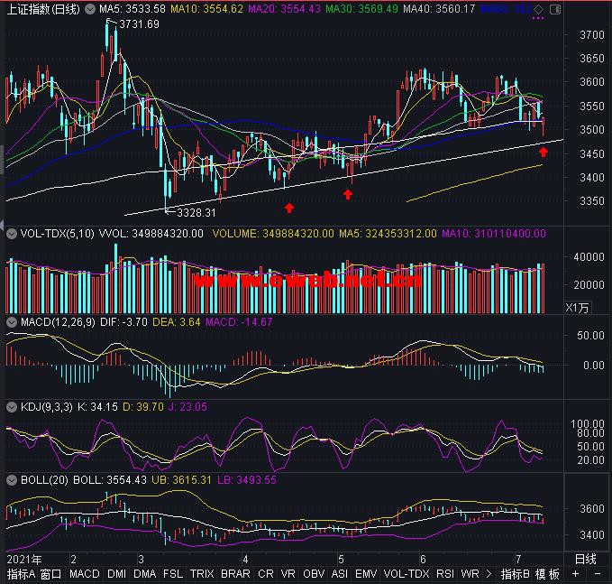 截至收盘,沪指涨-0.04%,报3524.09点,成交4930亿元,成交金额比上个交易日微微减少,上涨家数1160家,下跌家数726家;深成指涨-0.26%报14844.36点,成交6346.17亿元; 创业板指涨-0.69%,报3409.31点,成交2610.00亿元比上个交易日2901.77亿元减少。102家左右非st股票涨停,6家左右非st股票跌停。 【今日热点】 行业板块:有色5.66%,综合类2.88%,钢铁2.64%;概念股:磷化工概念股8.67%,稀缺资源概念股5.75%,稀土永磁概念股5.34% 【消息】 财政部印发《大气污染防治资金管理办法》 据财政部7月9日消息,为加强大气污染防治资金使用管理,财政部制定并印发《大气污染防治资金管理办法》。 城镇化工作暨城乡融合发展工作部际联席会议第三次会议召开 据国家发展改革委7月9月消息,7月6日,城镇化工作暨城乡融合发展工作部际联席会议第三次会议召开。会议要求,要保质保量完成《2021年新型城镇化和城乡融合发展重点任务》。 中汽协:中国6月份新能源汽车销量25.6万辆 同比增长139.3% 据“中汽协会数据”微信公众号7月9日消息,中国6月份汽车销量201.5万辆,同比减少12.4%。中国6月份新能源汽车销量25.6万辆,同比增长139.3%。 蔚来计划到2025年在全球建成超过4000座换电站 在7月9日举行的NIO Power Day上,蔚来汽车总裁秦力洪表示,计划到2025年在全球范围内建设超过4000座换电站。 【上证趋势】: 周线macd与kdj步入死叉共振,只要大涨就会改变技术指标 中美贸易争端:拜登上台对于贸易争端有所缓解 资金面分析:9日,净流入65.61亿元,大宗流入81.96亿元。1日,净流入-169.1亿元,大宗流入-45.65亿元。 外汇分析:美元转强,国际疫情加巨,印度失控。人民币升值受阻,央行上调外汇准备金,美元走出底部迹象明显 基本面:6月pmi50.9%,5月pmi51%,4月pmi51.1%低于市场预期,4月cpi同比上涨0.9%,PPI同比上涨6.8% 今日盘面解析:探底回升 上证综合分析:今日再挖坑,主力明修栈道暗度陈仓,主力连续挖坑肯定不白挖,指数新高概率高,60分钟五浪下行,上升趋势线下轨附近获得支撑,可能引发60分钟三浪上行,就有可能小转大,至少向3600点运动,大概率近期新高! 下个交易日预测:看涨 上证指数数据对比
