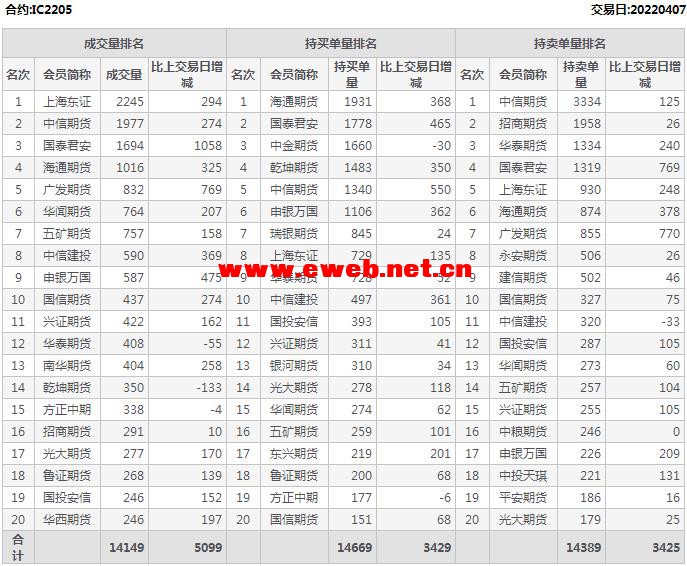 : 2022年4月7日IC中证500股指期货5月份合约(IC2205)持仓:多头主力增仓3429手,空头主力增仓3425手。