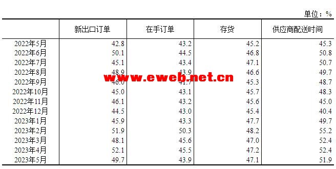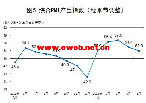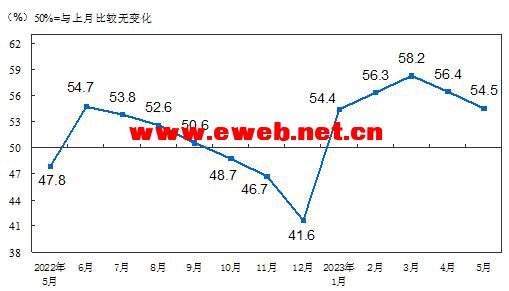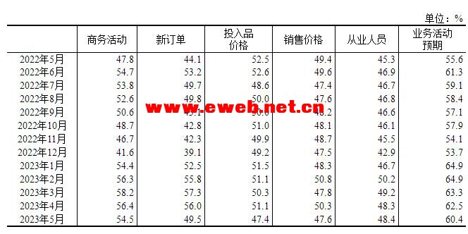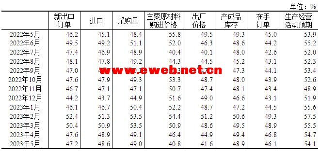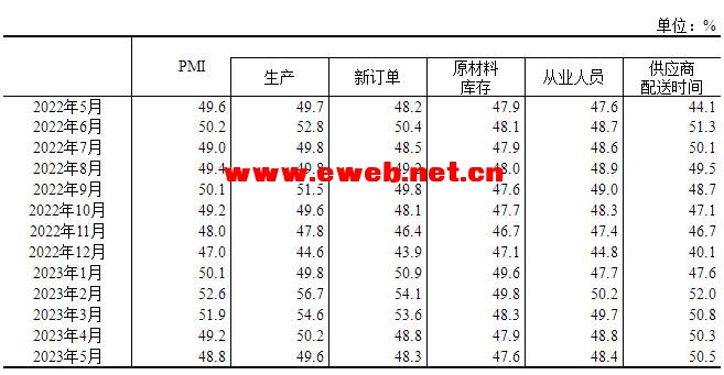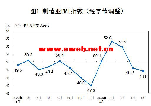 一、中国制造业采购经理指数运行情况 5月份,制造业采购经理指数(PMI)为48.8%,比上月下降0.4个百分点,低于临界点,制造业景气水平小幅回落。 从企业规模看,大型企业PMI为50.0%,比上月上升0.7个百分点,位于临界点;中、小型企业PMI分别为47.6%和47.9%,比上月下降1.6和1.1个百分点,低于临界点。 从分类指数看,在构成制造业PMI的5个分类指数中,供应商配送时间指数高于临界点,生产指数、新订单指数、原材料库存指数和从业人员指数均低于临界点。 生产指数为49.6%,比上月下降0.6个百分点,表明制造业生产活动有所放缓。 新订单指数为48.3%,比上月下降0.5个百分点,表明制造业市场需求继续回落。 原材料库存指数为47.6%,比上月下降0.3个百分点,表明制造业主要原材料库存降幅有所扩大。 从业人员指数为48.4%,比上月下降0.4个百分点,表明制造业企业用工景气度下降。 供应商配送时间指数为50.5%,比上月上升0.2个百分点,表明制造业原材料供应商交货时间持续加快。 表1 中国制造业PMI及构成指数(经季节调整) 表2 中国制造业PMI其他相关指标情况(经季节调整) 二、中国非制造业采购经理指数运行情况 5月份,非制造业商务活动指数为54.5%,比上月下降1.9个百分点,仍高于临界点,非制造业延续恢复性增长。 分行业看,建筑业商务活动指数为58.2%,比上月下降5.7个百分点;服务业商务活动指数为53.8%,比上月下降1.3个百分点。从具体行业看,铁路运输、水上运输、航空运输、电信广播电视及卫星传输服务、互联网软件及信息技术服务等行业商务活动指数位于60.0%以上高位景气区间;资本市场服务、房地产等行业商务活动指数低于临界点。 新订单指数为49.5%,比上月下降6.5个百分点,低于临界点,表明非制造业市场需求有所回落。分行业看,建筑业新订单指数为49.5%,比上月下降4.0个百分点;服务业新订单指数为49.5%,比上月下降6.9个百分点。 投入品价格指数为47.4%,比上月下降3.7个百分点,低于临界点,表明非制造业企业用于经营活动的投入品价格总体水平由升转降。分行业看,建筑业投入品价格指数为44.7%,比上月下降3.4个百分点;服务业投入品价格指数为47.9%,比上月下降3.8个百分点。 销售价格指数为47.6%,比上月下降2.7个百分点,低于临界点,表明非制造业销售价格总体水平较上月下降。分行业看,建筑业销售价格指数为46.9%,比上月下降4.6个百分点;服务业销售价格指数为47.8%,比上月下降2.3个百分点。 从业人员指数为48.4%,比上月上升0.1个百分点,表明非制造业企业用工景气水平略有回升。分行业看,建筑业从业人员指数为48.5%,比上月上升0.2个百分点;服务业从业人员指数为48.3%,比上月上升0.1个百分点。 业务活动预期指数为60.4%,比上月下降2.1个百分点,连续位于高位景气区间,表明非制造业企业对近期市场恢复发展持续看好。分行业看,建筑业业务活动预期指数为62.1%,比上月下降2.0个百分点;服务业业务活动预期指数为60.1%,比上月下降2.2个百分点。 表3 中国非制造业主要分类指数(经季节调整) 表4 中国非制造业其他分类指数(经季节调整) 三、中国综合PMI产出指数运行情况 5月份,综合PMI产出指数为52.9%,比上月下降1.5个百分点,继续保持在景气区间,表明我国企业生产经营总体延续恢复发展态势。 |