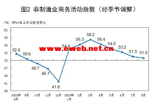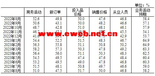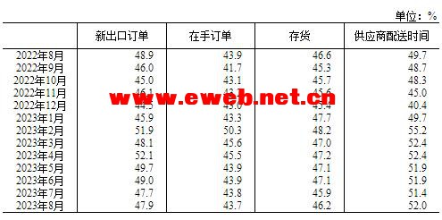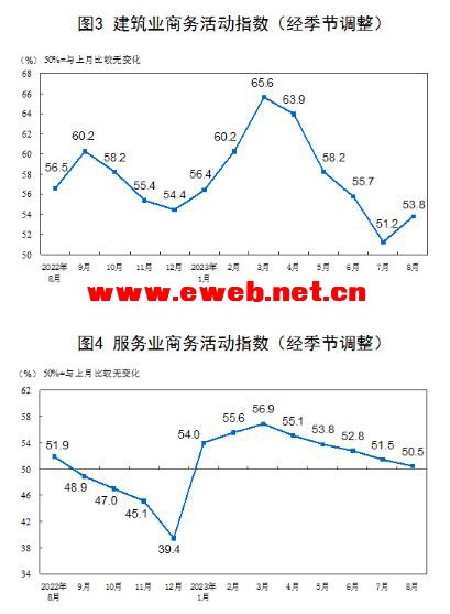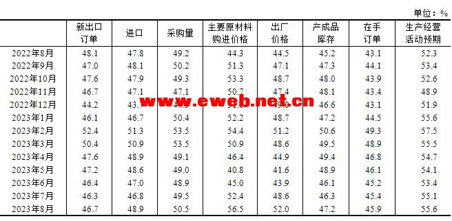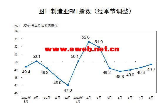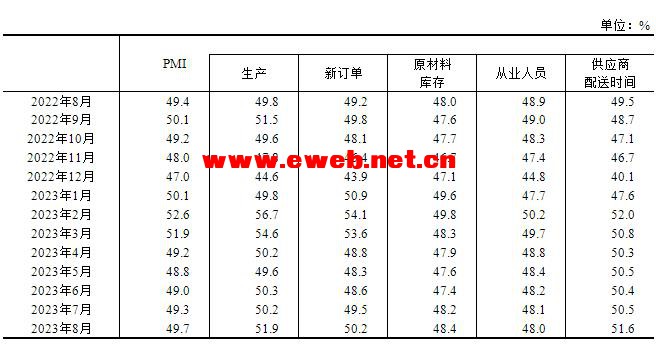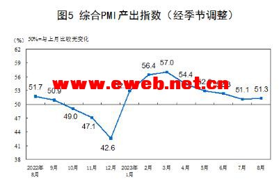 国家统计局服务业调查中心 中国物流与采购联合会 一、中国制造业采购经理指数运行情况 8月份,制造业采购经理指数(PMI)为49.7%,比上月上升0.4个百分点,制造业景气水平进一步改善。 从企业规模看,大、中、小型企业PMI分别为50.8%、49.6%和47.7%,比上月上升0.5、0.6和0.3个百分点。 从分类指数看,在构成制造业PMI的5个分类指数中,生产指数、新订单指数和供应商配送时间指数高于临界点,原材料库存指数、从业人员指数低于临界点。 生产指数为51.9%,比上月上升1.7个百分点,表明制造业生产扩张力度有所增强。 新订单指数为50.2%,比上月上升0.7个百分点,表明制造业市场需求有所改善。 原材料库存指数为48.4%,比上月上升0.2个百分点,表明制造业主要原材料库存量降幅继续收窄。 从业人员指数为48.0%,比上月略降0.1个百分点,表明制造业企业用工景气度基本稳定。 供应商配送时间指数为51.6%,比上月上升1.1个百分点,表明制造业原材料供应商交货时间加快。 表1 中国制造业PMI及构成指数(经季节调整) 表2 中国制造业PMI其他相关指标情况(经季节调整) 二、中国非制造业采购经理指数运行情况 8月份,非制造业商务活动指数为51.0%,比上月下降0.5个百分点,仍高于临界点,非制造业持续扩张。 分行业看,建筑业商务活动指数为53.8%,比上月上升2.6个百分点;服务业商务活动指数为50.5%,比上月下降1.0个百分点。从行业看,铁路运输、航空运输、住宿、餐饮、电信广播电视及卫星传输服务、生态保护及公共设施管理、文化体育娱乐等行业商务活动指数位于55.0%以上较高景气区间;资本市场服务、保险、房地产等行业商务活动指数低于临界点。 新订单指数为47.5%,比上月下降0.6个百分点,表明非制造业市场需求景气度下降。分行业看,建筑业新订单指数为48.5%,比上月上升2.2个百分点;服务业新订单指数为47.4%,比上月下降1.0个百分点。 投入品价格指数为51.7%,比上月上升0.9个百分点,表明非制造业企业用于经营活动的投入品价格总体水平继续上涨。分行业看,建筑业投入品价格指数为48.4%,比上月下降2.3个百分点;服务业投入品价格指数为52.3%,比上月上升1.5个百分点。 销售价格指数为50.0%,比上月上升0.3个百分点,位于临界点,表明非制造业销售价格总体水平与上月持平。分行业看,建筑业销售价格指数为50.4%,比上月下降1.6个百分点;服务业销售价格指数为49.9%,比上月上升0.6个百分点。 从业人员指数为46.8%,比上月上升0.2个百分点,表明非制造业企业用工景气度有所回升。分行业看,建筑业从业人员指数为44.7%,比上月下降0.5个百分点;服务业从业人员指数为47.2%,比上月上升0.4个百分点。 业务活动预期指数为58.2%,比上月下降0.8个百分点,继续处于较高景气区间,表明非制造业企业对近期市场恢复发展保持乐观。分行业看,建筑业业务活动预期指数为60.3%,比上月下降0.2个百分点;服务业业务活动预期指数为57.8%,比上月下降0.9个百分点。 表3 中国非制造业主要分类指数(经季节调整) 表4 中国非制造业其他分类指数(经季节调整) 三、中国综合PMI产出指数运行情况 8月份,综合PMI产出指数为51.3%,比上月上升0.2个百分点,继续保持在扩张区间,表明我国企业生产经营活动总体稳定扩张。 |