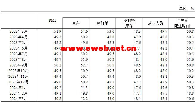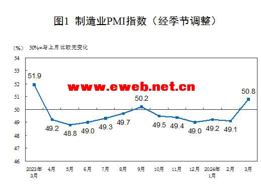 一、中国制造业采购经理指数运行情况 3月份,制造业采购经理指数(PMI)为50.8%,比上月上升1.7个百分点,高于临界点,制造业景气回升。 从企业规模看,大、中、小型企业PMI分别为51.1%、50.6%和50.3%,比上月上升0.7、1.5和3.9个百分点,均高于临界点。 从分类指数看,在构成制造业PMI的5个分类指数中,生产指数、新订单指数和供应商配送时间指数高于临界点,原材料库存指数和从业人员指数低于临界点。 生产指数为52.2%,比上月上升2.4个百分点,表明制造业企业生产活动加快。 新订单指数为53.0%,比上月上升4.0个百分点,表明制造业市场需求景气水平回升。 原材料库存指数为48.1%,比上月上升0.7个百分点,表明制造业主要原材料库存量降幅收窄。 从业人员指数为48.1%,比上月上升0.6个百分点,表明制造业企业用工景气度有所改善。 供应商配送时间指数为50.6%,比上月上升1.8个百分点,表明制造业原材料供应商交货时间有所加快。 表1 中国制造业PMI及构成指数(经季节调整) |