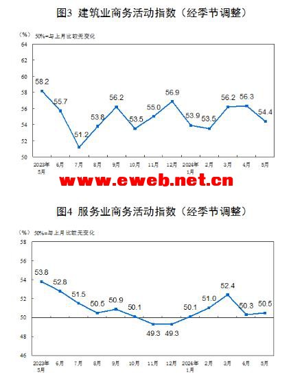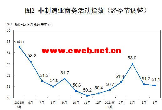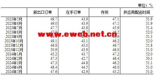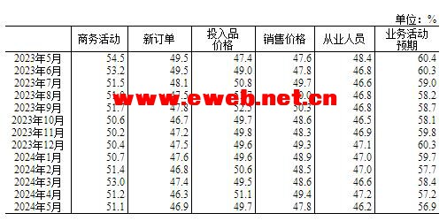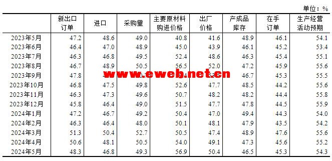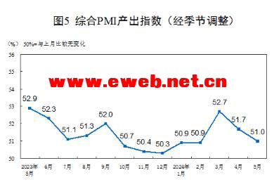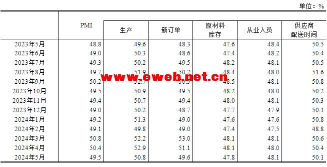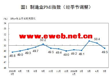 一、中国制造业采购经理指数运行情况 5月份,制造业采购经理指数(PMI)为49.5%,比上月下降0.9个百分点,制造业景气水平有所回落。 从企业规模看,大型企业PMI为50.7%,比上月上升0.4个百分点;中、小型企业PMI为49.4%和46.7%,比上月下降1.3和3.6个百分点。 从分类指数看,在构成制造业PMI的5个分类指数中,生产指数和供应商配送时间指数高于临界点,新订单指数、原材料库存指数和从业人员指数低于临界点。 生产指数为50.8%,比上月下降2.1个百分点,仍高于临界点,表明制造业企业生产继续保持扩张。 新订单指数为49.6%,比上月下降1.5个百分点,表明制造业市场需求有所放缓。 原材料库存指数为47.8%,比上月下降0.3个百分点,表明制造业主要原材料库存量减少。 从业人员指数为48.1%,比上月上升0.1个百分点,表明制造业企业用工景气度略有回升。 供应商配送时间指数为50.1%,比上月下降0.3个百分点,仍高于临界点,表明制造业原材料供应商交货时间略有加快。 表1 中国制造业PMI及构成指数(经季节调整) 表2 中国制造业PMI其他相关指标情况(经季节调整) 二、中国非制造业采购经理指数运行情况 5月份,非制造业商务活动指数为51.1%,与上月基本持平,非制造业继续保持扩张。 分行业看,建筑业商务活动指数为54.4%,比上月下降1.9个百分点;服务业商务活动指数为50.5%,比上月上升0.2个百分点。从行业看,邮政、电信广播电视及卫星传输服务、互联网软件及信息技术服务、文化体育娱乐等行业商务活动指数位于55.0%以上较高景气区间;资本市场服务、房地产等行业商务活动指数低于临界点。 新订单指数为46.9%,比上月上升0.6个百分点,表明非制造业市场需求景气度有所回升。分行业看,建筑业新订单指数为44.1%,比上月下降1.2个百分点;服务业新订单指数为47.4%,比上月上升0.9个百分点。 投入品价格指数为49.7%,比上月下降1.4个百分点,表明非制造业企业用于经营活动的投入品价格总体水平有所回落。分行业看,建筑业投入品价格指数为53.6%,比上月上升1.4个百分点;服务业投入品价格指数为49.0%,比上月下降1.9个百分点。 销售价格指数为47.8%,比上月下降1.6个百分点,表明非制造业销售价格总体水平有所回落。分行业看,建筑业销售价格指数为49.7%,比上月上升1.0个百分点;服务业销售价格指数为47.5%,比上月下降2.0个百分点。 从业人员指数为46.2%,比上月下降1.0个百分点,表明非制造业企业用工景气度有所降低。分行业看,建筑业从业人员指数为43.3%,比上月下降2.8个百分点;服务业从业人员指数为46.7%,比上月下降0.7个百分点。 业务活动预期指数为56.9%,比上月下降0.3个百分点,继续位于较高景气区间,表明非制造业企业对市场发展前景保持乐观。分行业看,建筑业业务活动预期指数为56.3%,比上月上升0.2个百分点;服务业业务活动预期指数为57.0%,比上月下降0.4个百分点。 表3 中国非制造业主要分类指数(经季节调整) 表4 中国非制造业其他分类指数(经季节调整) 三、中国综合PMI产出指数运行情况 5月份,综合PMI产出指数为51.0%,比上月下降0.7个百分点,继续高于临界点,表明我国企业生产经营活动总体保持恢复发展态势。 |
