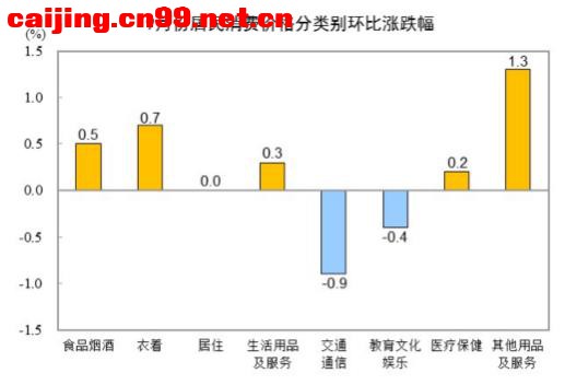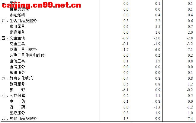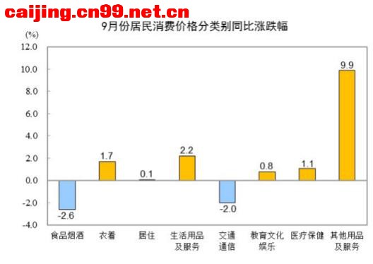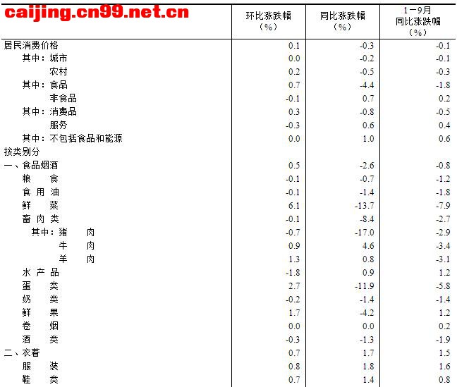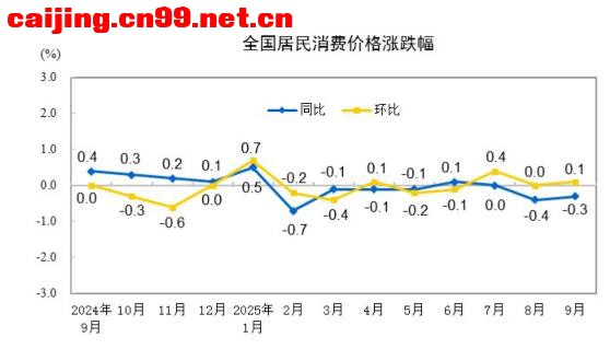 2025年9月份,全国居民消费价格同比下降0.3%。其中,城市下降0.2%,农村下降0.5%;食品价格下降4.4%,非食品价格上涨0.7%;消费品价格下降0.8%,服务价格上涨0.6%。1—9月平均,全国居民消费价格比上年同期下降0.1%。 9月份,全国居民消费价格环比上涨0.1%。其中,城市持平,农村上涨0.2%;食品价格上涨0.7%,非食品价格下降0.1%;消费品价格上涨0.3%,服务价格下降0.3%。 一、各类商品及服务价格同比变动情况 9月份,食品烟酒类价格同比下降2.6%,影响CPI(居民消费价格指数)下降约0.74个百分点。食品中,鲜菜价格下降13.7%,影响CPI下降约0.35个百分点;蛋类价格下降11.9%,影响CPI下降约0.08个百分点;畜肉类价格下降8.4%,影响CPI下降约0.27个百分点,其中猪肉价格下降17.0%,影响CPI下降约0.26个百分点;鲜果价格下降4.2%,影响CPI下降约0.09个百分点;粮食价格下降0.7%,影响CPI下降约0.01个百分点;水产品价格上涨0.9%,影响CPI上涨约0.02个百分点。 其他七大类价格同比六涨一降。其中,其他用品及服务、生活用品及服务、衣着价格分别上涨9.9%、2.2%和1.7%,医疗保健、教育文化娱乐、居住价格分别上涨1.1%、0.8%和0.1%;交通通信价格下降2.0%。 二、各类商品及服务价格环比变动情况 9月份,食品烟酒类价格环比上涨0.5%,影响CPI上涨约0.13个百分点。食品中,鲜菜价格上涨6.1%,影响CPI上涨约0.13个百分点;蛋类价格上涨2.7%,影响CPI上涨约0.02个百分点;鲜果价格上涨1.7%,影响CPI上涨约0.03个百分点;水产品价格下降1.8%,影响CPI下降约0.04个百分点;猪肉价格下降0.7%,影响CPI下降约0.01个百分点。 其他七大类价格环比四涨一平两降。其中,其他用品及服务、衣着价格分别上涨1.3%和0.7%,生活用品及服务、医疗保健价格分别上涨0.3%和0.2%;居住价格持平;交通通信、教育文化娱乐价格分别下降0.9%和0.4%。 2025年9月份居民消费价格主要数据 |