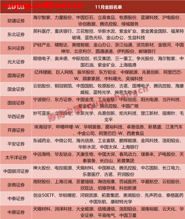 随着10月交易收官,券商11月金股名单渐次披露。 整体来看,券商11月金股主要集中在电子、电力设备、有色金属等板块,腾讯控股、紫金矿业等个股被多家机构推荐。 展望11月,各券商普遍认为市场大概率保持上行趋势,科技、能源资源等板块受到机构青睐。部分券商认为,风格切换的概率较低,科技内部分赛道拥挤度较高,但科技风格整体并不拥挤,建议关注科技内部交易不拥挤的方向。 10月最牛金股当月涨超65% 回顾10月,A股各大指数涨跌不一,上证指数、北证50指数分别在10月上涨1.85%、3.54%,而创业板指则在10月累计下跌1.56%,科创50指数则累计跌超5%。 每市APP数据显示,券商推荐10月金股中,由东方财富证券独家推荐的国盾量子在10月上涨超65%,是10月表现最好的金股。由中泰证券推荐的荣信文化,在10月上涨近65%。排名第三的是由天风证券推荐的江波龙,10月上涨超46%。此外,由东兴证券推荐的金银河、由华龙证券推荐的欧科亿,也在10月涨超30%。 从各券商金股组合收益率表现来看,10月券商金股组合收益率集体回撤,在每市APP收录的40余家券商金股组合中,仅5家券商收益率为正。具体来看,西部证券金股组合以4.05%的月度收益率排名第一,其次是平安证券金股组合(10月上涨3.16%),长城证券金股组合以2.09%的收益率排名第三,随后是东兴证券、中银证券,也在十月取得正收益。 11月金股出炉,电子、有色、电力设备热度高 进入11月,券商最新一期金股名单陆续出炉。 从目前已经披露的金股名单来看,11月金股主要集中在电子、电力设备、有色金属等板块。 腾讯控股受到国信证券、国金证券等4家券商共同推荐,热度暂居第一。国金证券认为,腾讯控股AI全面重塑生态系统,构建核心护城河;同时,业务结构优化带来的盈利能力改善比单纯的降本增效更具可持续性,预计未来几年利润增速将持续快于收入增速。 有色金属板块中,紫金矿业受到光大证券、国信证券等3家券商推荐。国信证券认为,金、铜价格共振向上背景下,公司业绩弹性大、兑现度高,估值性价比高;紫金黄金国际的上市有望带来估值重估。洛阳钼业、云铝股份均被不少于2家券商推荐;此外,楚江新材、东方钽业、华友钴业、神火股份、紫金黄金国际等公司也被部分券商推为11月金股。 电子板块近期受到市场热捧,11月金股中,包括工业富联、沪电股份、兆易创新等公司均被不少于2家券商推荐。其中,太平洋证券对于沪电股份的推荐理由包括:AI需求爆发拉动公司服务器交换机业务高增长;ASIC(专用集成电路)高景气,业绩持续释放等等。 电力设备也是11月热门板块,各券商推荐的金股标的集中度较低,目前仅天赐材料获得2家券商共同推荐。中原证券认为,六氟和电解液价格快速上涨,天赐材料作为行业龙头将受益。此外,当升科技、金风科技、璞泰来、欣旺达、阳光电源、亿纬锂能、震裕科技等公司也被部分券商选为11月金股。 此外,目前被不少于两家券商推荐的金股还有通信板块的中际旭创,家电板块的海尔智家、水泥板块的华新水泥,以及港股的阿里巴巴-W、古茗等等。 机构:11月市场趋势依然向上 展望11月A股市场,各券商普遍认为市场大概率保持上行趋势,科技、能源资源等板块受到机构青睐。 中国银河证券策略首席杨超认为,10月受国际局势、宏观经济数据或部分行业基本面担忧影响,市场整体风险偏好下降,追求确定性和防御性,市场整体重心略有上移,但赚钱效应并不广泛。展望11月,A股市场预计将在政策驱动与外部环境改善的双重支撑下呈现震荡上行格局。刚刚公布的“十五五”规划建议稿为市场指明了清晰的投资方向,科技自立自强、现代化产业体系建设、国家安全能力建设等战略任务将成为贯穿全月的投资主线。 布局上,中国银河证券建议关注四大线索,一是TMT与科技自立自强主线,重点布局通信基础设施、半导体制造与设备、工业软件与互联网平台等关键环节;二是高端制造与绿色转型主线,重点布局工业母机、航空航天、新能源装备、新材料等先进制造领域;三是能源资源安全主线,重点配置煤炭、电力等供需格局偏紧领域,以及有色金属等战略性资源品种;四是金融支持实体经济主线。 中泰证券策略首席徐驰认为,往后看,市场胜率坚实,结构牛情形下赔率空间有限,科技风格有望持续,风格切换的概率较低。配置上,科技内部分赛道拥挤度较高,但科技风格整体并不拥挤,建议关注:科技内部交易不拥挤的方向,如港股互联网、消费电子等;受益于联储降息和海外财政扩张的全球定价资源品,如黄金和铜;海外需求相关的制造业。 东海证券认为,短期来看,中美贸易摩擦的缓和、美联储预防式降息的延续、国内四季度增量财政政策的加速落地,将进一步提升国内权益资产的确定性和持续性。在新一轮人工智能为主导的科技变革中,从基础研究、基础设施建设,再到AI应用到各个领域,仍然是长周期投资主线。展望11月,继续看好科技主线,关注人工智能方向;同时,关注“十五五”规划建议中提及的四大战略性新兴产业和六大未来产业的投资机会;三是关注四季度稳投资预期升温下的投资机会,以及其对上游资源品需求的拉动。 国盛证券策略首席杨柳认为,大势层面,中期趋势依旧向上,短期颠簸或有增多。中期维度,货币宽松加码尚有潜力,价格修复在途,盈利周期企稳上行延续,需求走向虽有分歧,但变数更多在