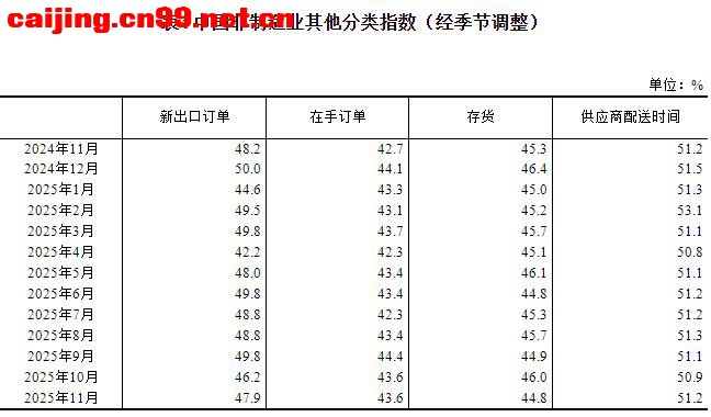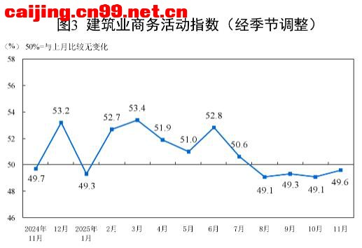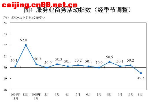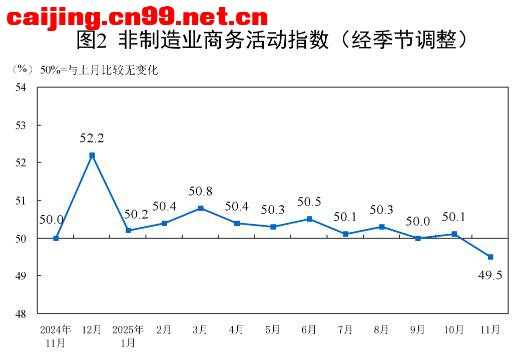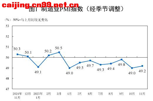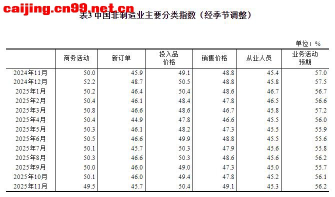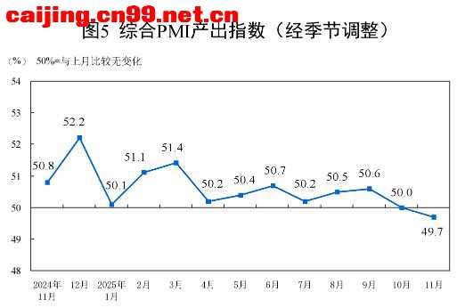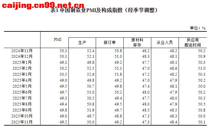 一、中国制造业采购经理指数运行情况 11月份,制造业采购经理指数(PMI)为49.2%,比上月上升0.2个百分点,景气水平有所改善。 从企业规模看,大型企业PMI为49.3%,比上月下降0.6个百分点,低于临界点;中、小型企业PMI分别为48.9%和49.1%,比上月上升0.2个和2.0个百分点,均低于临界点。 从分类指数看,在构成制造业PMI的5个分类指数中,供应商配送时间指数高于临界点,生产指数位于临界点,新订单指数、原材料库存指数和从业人员指数均低于临界点。 生产指数为50.0%,比上月上升0.3个百分点,位于临界点,表明制造业生产总体稳定。 新订单指数为49.2%,比上月上升0.4个百分点,表明制造业市场需求景气水平有所改善。 原材料库存指数为47.3%,与上月持平,低于临界点,表明制造业主要原材料库存量继续减少。 从业人员指数为48.4%,比上月上升0.1个百分点,表明制造业企业用工景气度小幅回升。 供应商配送时间指数为50.1%,比上月上升0.1个百分点,表明制造业原材料供应商交货时间略有加快。 二、中国非制造业采购经理指数运行情况 11月份,非制造业商务活动指数为49.5%,比上月下降0.6个百分点。 分行业看,建筑业商务活动指数为49.6%,比上月上升0.5个百分点;服务业商务活动指数为49.5%,比上月下降0.7个百分点。从服务业行业看,铁路运输、电信广播电视及卫星传输服务、货币金融服务等行业商务活动指数均位于55.0%以上较高景气区间;房地产、居民服务等行业商务活动指数均低于临界点。 新订单指数为45.7%,比上月下降0.3个百分点,表明非制造业市场需求回落。分行业看,建筑业新订单指数为46.1%,比上月上升0.2个百分点;服务业新订单指数为45.6%,比上月下降0.4个百分点。 投入品价格指数为50.4%,比上月上升1.0个百分点,表明非制造业企业用于经营活动的投入品价格总体水平有所上升。分行业看,建筑业投入品价格指数为49.7%,比上月上升0.1个百分点;服务业投入品价格指数为50.5%,比上月上升1.1个百分点。 销售价格指数为49.1%,比上月上升1.3个百分点,仍低于临界点,表明非制造业销售价格总体水平降幅收窄。分行业看,建筑业销售价格指数为48.4%,与上月持平;服务业销售价格指数为49.2%,比上月上升1.5个百分点。 从业人员指数为45.3%,比上月上升0.1个百分点,表明非制造业企业用工景气度略有改善。分行业看,建筑业从业人员指数为41.8%,比上月上升1.9个百分点;服务业从业人员指数为45.9%,比上月下降0.2个百分点。 业务活动预期指数为56.2%,比上月上升0.1个百分点,表明多数非制造业企业对市场发展保持乐观。分行业看,建筑业业务活动预期指数为57.9%,比上月上升1.9个百分点;服务业业务活动预期指数为55.9%,比上月下降0.2个百分点。 三、中国综合PMI产出指数运行情况 11月份,综合PMI产出指数为49.7%,比上月下降0.3个百分点。 |