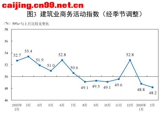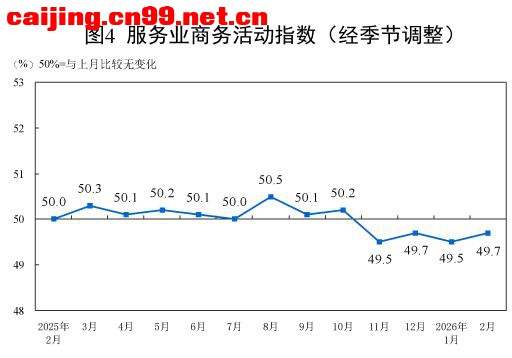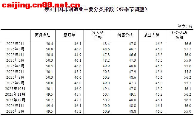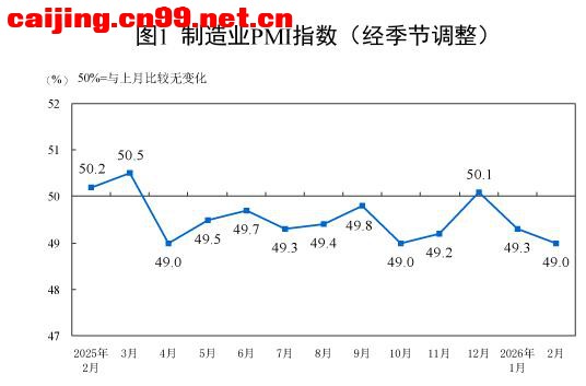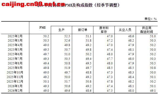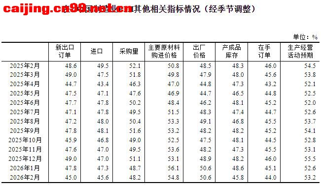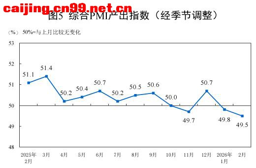 一、中国制造业采购经理指数运行情况 2月份,制造业采购经理指数(PMI)为49.0%,比上月下降0.3个百分点,制造业景气水平有所回落。 从企业规模看,大型企业PMI为51.5%,比上月上升1.2个百分点,高于临界点;中、小型企业PMI分别为47.5%和44.8%,比上月下降1.2个和2.6个百分点,低于临界点。 从分类指数看,构成制造业PMI的5个分类指数中,生产指数、新订单指数、原材料库存指数、从业人员指数和供应商配送时间指数均低于临界点。 生产指数为49.6%,比上月下降1.0个百分点,表明制造业生产活动有所放缓。 新订单指数为48.6%,比上月下降0.6个百分点,表明制造业市场需求景气度下降。 原材料库存指数为47.5%,比上月上升0.1个百分点,表明制造业主要原材料库存量降幅略有收窄。 从业人员指数为48.0%,比上月下降0.1个百分点,表明制造业企业用工景气度略有回落。 供应商配送时间指数为49.1%,比上月下降1.0个百分点,表明制造业原材料供应商交货时间较上月放慢。 二、中国非制造业采购经理指数运行情况 2月份,非制造业商务活动指数为49.5%,比上月上升0.1个百分点,非制造业景气水平有所改善。 分行业看,建筑业商务活动指数为48.2%,比上月下降0.6个百分点;服务业商务活动指数为49.7%,比上月上升0.2个百分点。从服务业行业看,住宿、餐饮、文化体育娱乐等行业商务活动指数均位于60.0%以上高位景气区间;资本市场服务、房地产等行业商务活动指数均低于临界点。 新订单指数为45.2%,比上月下降0.9个百分点,表明非制造业市场需求有所回落。分行业看,建筑业新订单指数为42.2%,比上月上升2.1个百分点;服务业新订单指数为45.7%,比上月下降1.4个百分点。 投入品价格指数为50.9%,比上月上升0.9个百分点,表明非制造业企业用于经营活动的投入品价格总体水平有所上涨。分行业看,建筑业投入品价格指数为49.1%,比上月下降2.9个百分点;服务业投入品价格指数为51.2%,比上月上升1.5个百分点。 销售价格指数为48.8%,与上月持平,仍低于临界点,表明非制造业销售价格总体水平低于上月。分行业看,建筑业销售价格指数为47.6%,比上月下降0.6个百分点;服务业销售价格指数为49.0%,比上月上升0.1个百分点。 从业人员指数为46.0%,比上月下降0.1个百分点,表明非制造业企业用工景气度略有回落。分行业看,建筑业从业人员指数为42.5%,比上月上升1.4个百分点;服务业从业人员指数为46.6%,比上月下降0.4个百分点。 业务活动预期指数为55.0%,比上月下降1.0个百分点,仍位于较高景气区间,表明非制造业企业对市场发展保持信心。分行业看,建筑业业务活动预期指数为50.9%,比上月上升1.1个百分点;服务业业务活动预期指数为55.8%,比上月下降1.3个百分点。 三、中国综合PMI产出指数运行情况 2月份,综合PMI产出指数为49.5%,比上月下降0.3个百分点,表明我国企业生产经营活动总体较上月有所放缓。 |