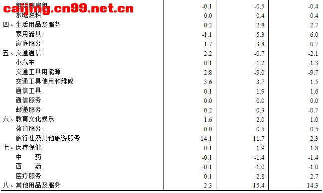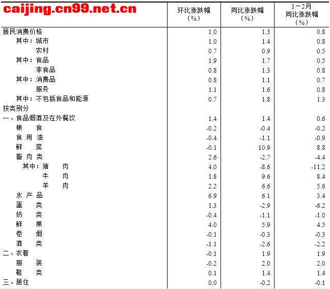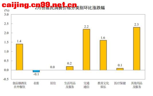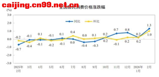 2026年2月份,全国居民消费价格同比上涨1.3%。其中,城市上涨1.4%,农村上涨0.9%;食品价格上涨1.7%,非食品价格上涨1.3%;消费品价格上涨1.1%,服务价格上涨1.6%。1—2月平均,全国居民消费价格比上年同期上涨0.8%。 2月份,全国居民消费价格环比上涨1.0%。其中,城市上涨1.0%,农村上涨0.7%;食品价格上涨1.9%,非食品价格上涨0.8%;消费品价格上涨0.8%,服务价格上涨1.1%。 一、各类商品及服务价格同比变动情况 2月份,食品烟酒及在外餐饮类价格同比上涨1.4%,影响CPI(居民消费价格指数)上涨约0.41个百分点。食品中,鲜菜价格上涨10.9%,影响CPI上涨约0.19个百分点;水产品价格上涨6.1%,影响CPI上涨约0.11个百分点;鲜果价格上涨5.9%,影响CPI上涨约0.12个百分点;蛋类价格下降2.9%,影响CPI下降约0.02个百分点;畜肉类价格下降2.7%,影响CPI下降约0.11个百分点,其中猪肉价格下降8.6%,影响CPI下降约0.17个百分点。 其他七大类价格同比五涨两降。其中,其他用品及服务、生活用品及服务、教育文化娱乐价格分别上涨15.4%、2.8%和2.0%,衣着、医疗保健价格均上涨1.9%;交通通信、居住价格分别下降0.7%和0.2%。 二、各类商品及服务价格环比变动情况 2月份,食品烟酒及在外餐饮类价格环比上涨1.4%,影响CPI上涨约0.40个百分点。食品中,水产品价格上涨6.9%,影响CPI上涨约0.13个百分点;鲜果价格上涨4.0%,影响CPI上涨约0.08个百分点;畜肉类价格上涨2.6%,影响CPI上涨约0.11个百分点,其中猪肉价格上涨4.0%,影响CPI上涨约0.07个百分点;蛋类价格上涨1.3%,影响CPI上涨约0.01个百分点。 其他七大类价格环比五涨一平一降。其中,其他用品及服务、交通通信、教育文化娱乐价格分别上涨2.3%、2.2%和1.6%,生活用品及服务、医疗保健价格分别上涨0.2%和0.1%;居住价格持平;衣着价格下降0.1%。 2026年2月份居民消费价格主要数据 4\5 |