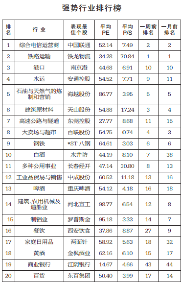 上周,综合电信运营商、铁路运输、港口、水运、石油与天然气的炼制和营销、建筑原材料、高速公路与隧道、大卖场与超市、钢铁、白酒行业居前十位。其中,高速公路与隧道行业排名第7,是跻身前十名的新晋者。 综合电信运营商行业近一周排名大幅上升,跻身前三。中国电信物联网运营中心刘玉明总监表示,2017年上半年,中国电信将建成规模、覆盖、质量和应用范围都居全球领先地位的NB-IoT网络,实现全网商用部署,为智能时代的万物互联奠定坚实基础。川财证券表示,NB-IoT通信芯片、NB-IoT通信模组和支持NB-IoT功能的移动通信网络这些支持NB-IoT各种应用的基础条件,均有望在2017年上半年能进入大规模商用状态。NB-IoT燃气表和水表在2017年上半年大概率能进入大规模商用状态,NB-IoT燃气表的第一个订单已锁定,NB-IoT物联网的时代正在加速到来。个股方面,重点推荐国内行业龙头及关联企业。推荐标的:金卡智能、三川智慧、新天科技。 商业银行行业上周排名上升24位,居第19位。迄今为止,上市银行年报最大的超预期之处,当属国有大行资产质量的超预期好转。招商证券表示,实体制造业信贷需求跟去年相比有明显提升,贷款定价水平上行。与近期在江浙地区进行的银行草根调研反馈一致,在去年以来大力度的基建投资带动下,投资扩产趋势开始往制造业等实体部门扩散,这预示着经济复苏的持续性和范围极有可能超预期。个股方面,经济超预期复苏给银行股带来的估值修复空间须把握,建议布局参与。推荐标的:建设银行、南京银行。 港口近三个月排名持续上升,目前排名第3。目前国企改革、“一带一路”、自贸区等政策和措施持续推进,主题板块继续发酵。华创证券表示,随着中国经济的企稳回升,“一带一路”沿线国家贸易的快速增长,会逐步体现在港口经营数据中。个股方面,推荐盈利超预期或具有改革背景或有整合预期的企业。推荐标的:上港集团、唐山港、天津港。 环保服务行业排名第88,较前周下降15名。京津冀及周边地区大气污染防治措施进一步落地,如北京彻底结束燃煤发电历史。申万宏源证券表示,2017年为“大气十条”考核年,京津冀区域环境整治力度提升将有利于监测、治污类企业发展。个股方面,大气的监测与治理、土壤修复等高景气的子行业存在较大的投资机会。推荐标的:先河环保、雪迪龙、清新环境。 |