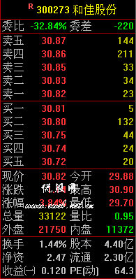 委比是衡量一段时间内场内买、卖盘强弱的技术指标。它的计算公式为:委比=(委买手数-委卖手数)/(委买手数+委卖手数)×100%。从公式中可以看出,委比的取值范围从-100%至+100%。若委比为正值,说明场内买盘较强,且数值越大,买盘就越强劲。反之,若委比为负值,则说明市道较弱。为及时反映场内的即时买卖盘强弱情况,委买手数是指即时向下五档的委托买入的总手数,委卖手数是指即时向上五档的委托卖出总手数。 例如:300273和佳股份 【(5+132+44+24+20)-(23+34+33+211+114)】/【(5+132+44+24+20)+(23+34+33+211+114)】*100%=-32.84% |