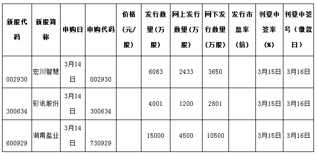湖南盐业、彩讯股份、宏川智慧3只新股下周申购