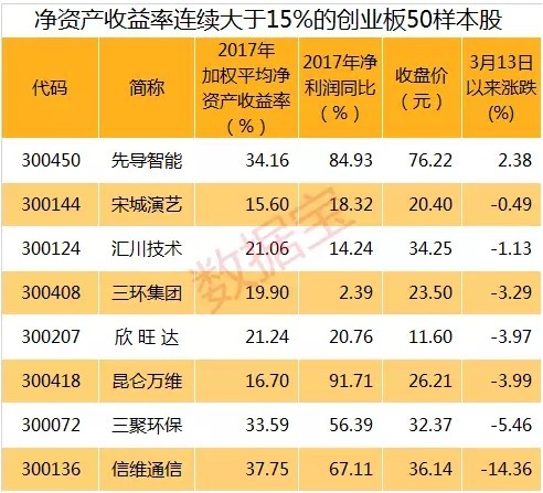 大震荡市中,创业板近两日强势反弹,创蓝筹首当其冲,成为反弹先锋。 在一定程度上代表创蓝筹的创业板50指数本周一大涨3.59%,今日再度以4.3%的涨幅在大盘主要指数中领涨。相比之下,上证指数近两日累计微涨0.44%,白马股持续疲弱,上证50指数下挫1.57%。 创业板50指数样本股将于4月的第一个交易日实施定期调整。净资产收益率连续三年大于15%的101只个股中,10只属于创业板50样本股。 具体来看,电子板块包含三环集团等3只,传媒板块包含昆仑万维等2只,计算机、机械设备、公用事业、电气设备等行业均有1只股票入围。进一步梳理发现,其中8只2017年净利润同比增长。 近两日大涨逾一成的先导智能,股价已基本收复失地。公司2017年加权平均净资产收益率为34.16%,净利润同比增长84.93%。先导智能今年一季度业绩预告亮相,净利润预计同比增长80%至110%。业绩大幅增长主要受益于锂电池行业快速持续发展,公司在稳定原有客户的基础上,积极开拓新客户,锂电池相关设备的生产销售业绩较去年同期有显著提升,此外,合并报表范围内较上年同期新增全资子公司珠海泰坦新动力电子有限公司的净利润。 |